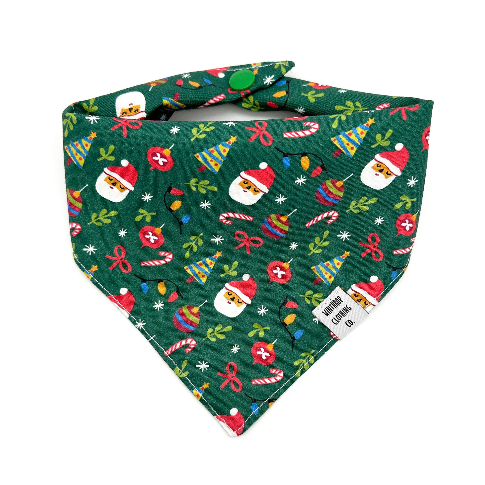 Our dog bandanas feature snaps that secure the end ties in place. Each dog bandana is top stitched and double sided. Print placement will vary for each dog bandana. Handmade with love in the U.S.A.