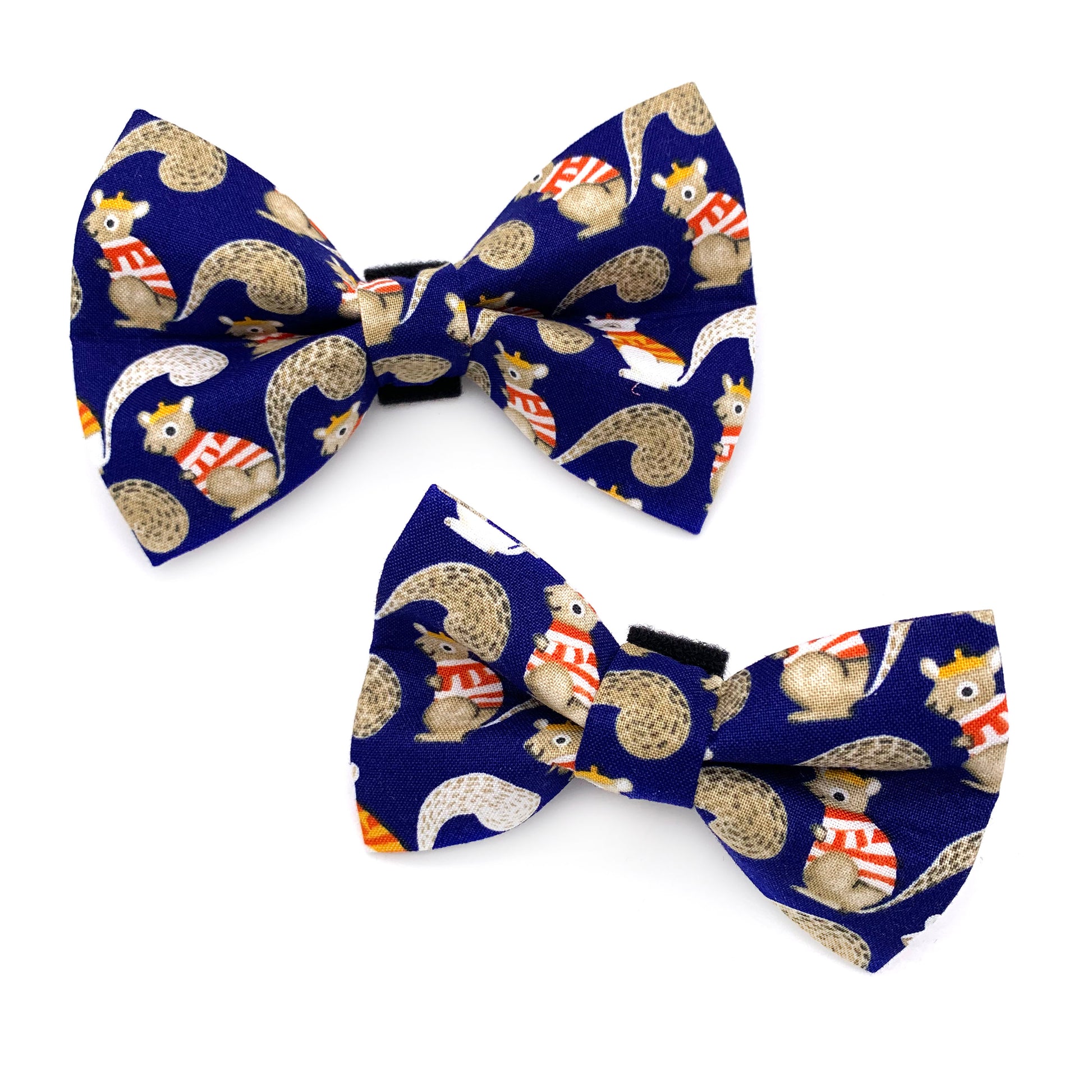 Our high quality dog bow ties are made to last. They hold their shape and can be worn multiple times for different occasions. The bow tie is made with a velcro fastening strap. The strap is also adjustable and fits collars up to 1.5" wide. You can effortlessly secure or remove the bow tie from your pet's collar without removing the collar itself!